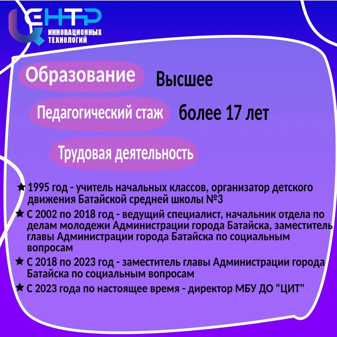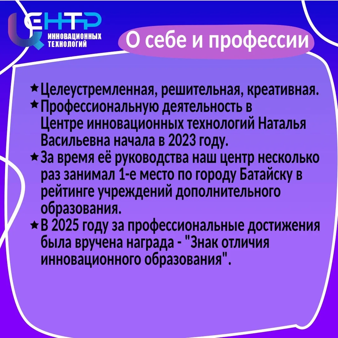 В этом выпуске расскажем о руководителе нашего "ЦИТа" - Кузьменко Наталье Васильевне. Талантливый и опытный профессионал, посвятивший свою карьеру развитию инновационных проектов и поддержке молодежного творчества. Директором "ЦИТа" Наталья Васильевна стала в 2023 году. Под ее руководством наш центр стал местом, где реализуются самые смелые идеи, проводятся интересные мероприятия и создаются уникальные образовательные программы. Она активно участвует в жизни "ЦИТа", вдохновляя своих коллег и подопечных на достижения. Мы уверенны, что под руководством Натальи Васильевны впереди нас ждут еще новые достижения и профессиональные победы!
