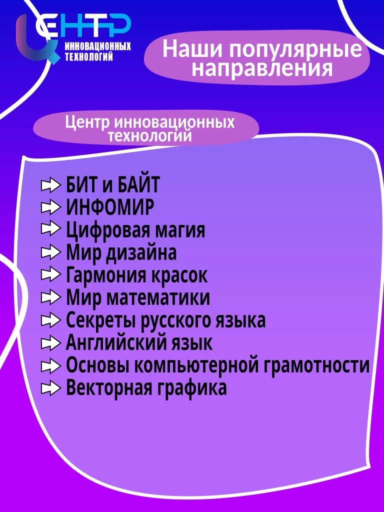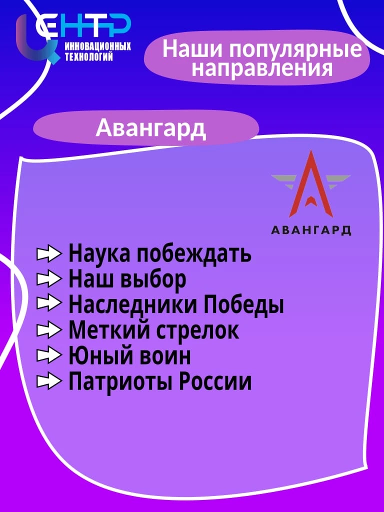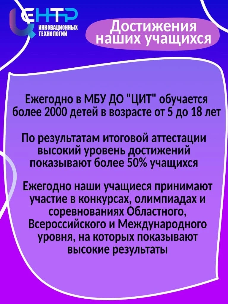 На данный момент "Центр инновационных технологий" имеет два структурных подразделения: УМЦ "Авангард", направленный на патриотическое воспитание молодёжи, расположенный по адресу СЖМ, 16. И IT-КУБ, который помогает учащимся нашего города в освоении it-технологий и расположен по адресу М.Горького, 101. Много лет мы помогаем детям осваивать нужные, востребованные направления обучения и не собираемся останавливаться на достигнутом!
