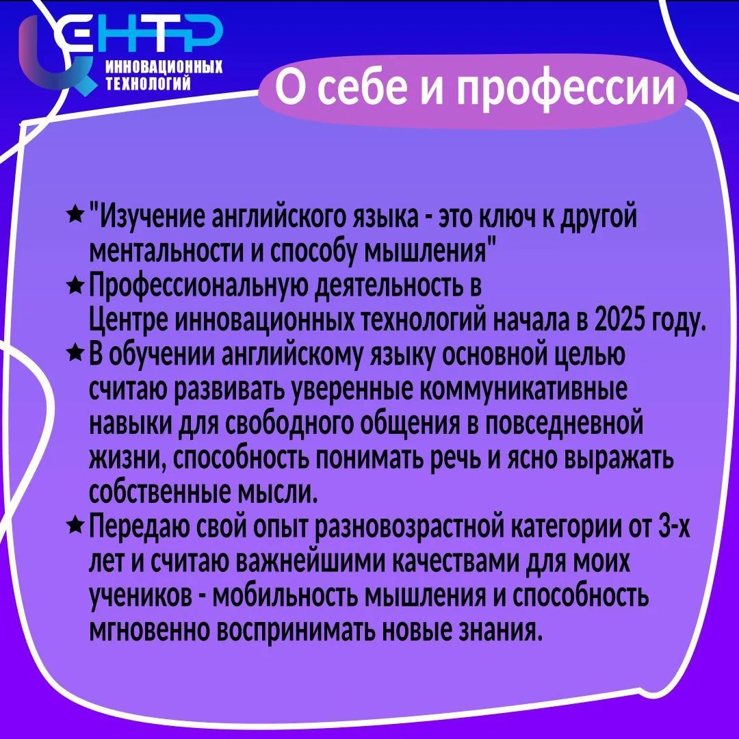 Анна Петровна уверена, что изучение иностранного языка – это не просто освоение грамматики и лексики, а настоящее путешествие в мир культуры, традиций и новых возможностей. Именно поэтому её уроки наполнены интересными играми, интерактивными заданиями и познавательными проектами, благодаря которым дети легко и с удовольствием осваивают материал. Мы гордимся, что в нашей команде работает такой талантливый и преданный своему делу педагог, как Анна Петровна. Её энергия и профессионализм вдохновляют и взрослых, и детей на новые достижения и личностный рост. Следите за нашими обновлениями — впереди много интересного! #ЦИТБатайск #ЦИТВЛИЦАХ #английскийязыкБатайск #ЦИТпедагоги