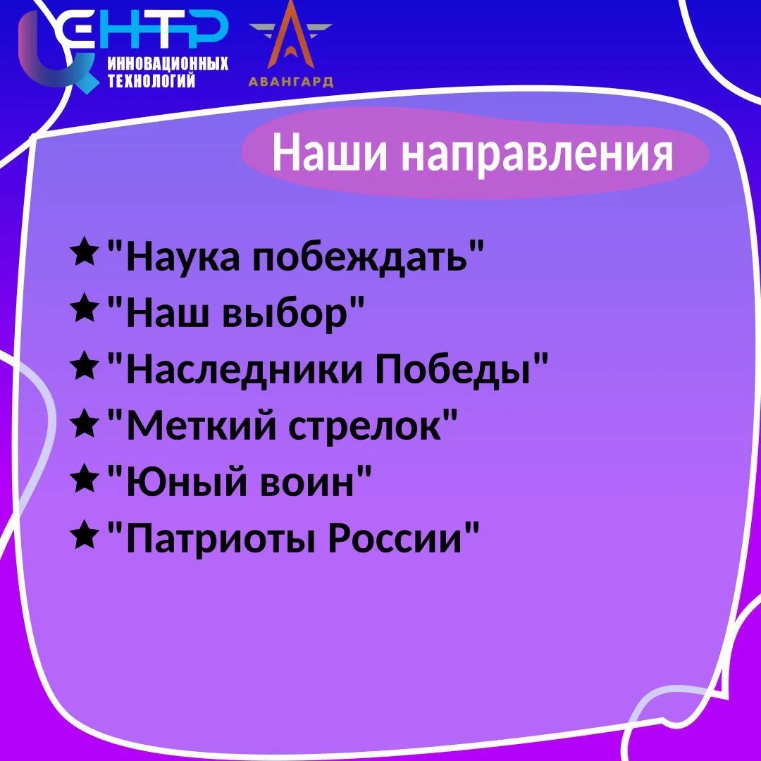 Учебно-методический центр военно-патриотического воспитания молодёжи "Авангард" был открыт на базе нашего "ЦИТа"в 2022 году и с тех пор активно развивается как важное образовательное подразделение, ориентированное на формирование у подрастающего поколения патриотизма, гражданской ответственности и высокого морального духа. Центр создаёт благоприятные условия для всестороннего развития молодёжи, объединяя современные методики обучения с традиционными ценностями российской культуры и истории.