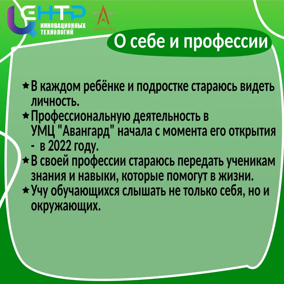 Сегодня Наталья Владимировна преподаёт в УМЦ "Авангард" ключевые направления, которые формируют личность и патриотизм молодых людей. Среди её учебных курсов особое место занимают программы "Наука побеждать", "Наследники Победы" и "Наш выбор". Эти курсы направлены не только на передачу знаний, но и на воспитание ответственности, гражданской позиции и стремления к победам — как в повседневной жизни, так и на жизненном пути каждого обучающегося. Благодаря профессионализму, харизме и отдаче Натальи Владимировны, её ученики не просто получают знания — они учатся быть настоящими наследниками славных традиций и выбирать правильный путь в жизни. Мы уверены, что вклад Натальи Владимировны в образовательный процесс невозможно переоценить, и желаем ей новых успехов и вдохновения в работе!