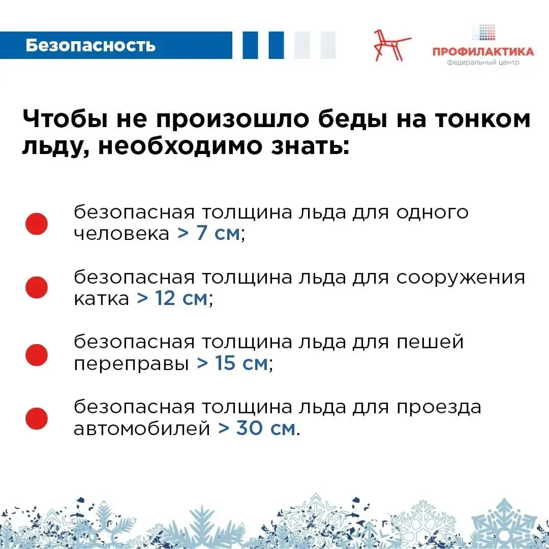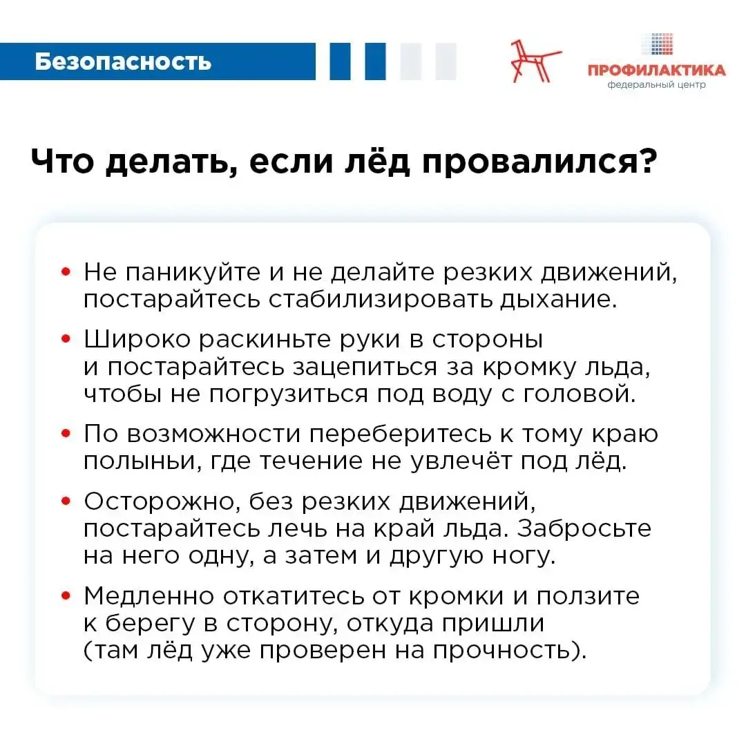 Тонкий лёд представляет собой большую опасность. Ежегодно в его ловушку попадает множество людей, в том числе дети, которые гуляют вблизи замерзших водоемов без присмотра родителей. Избежать трагических последствий можно, если соблюдать меры личной безопасности. В карточках, подготовленных по материалам МЧС России, рассказали о мерах безопасности. Расскажите о правилах детям и поделитесь советами с родными и близкими!